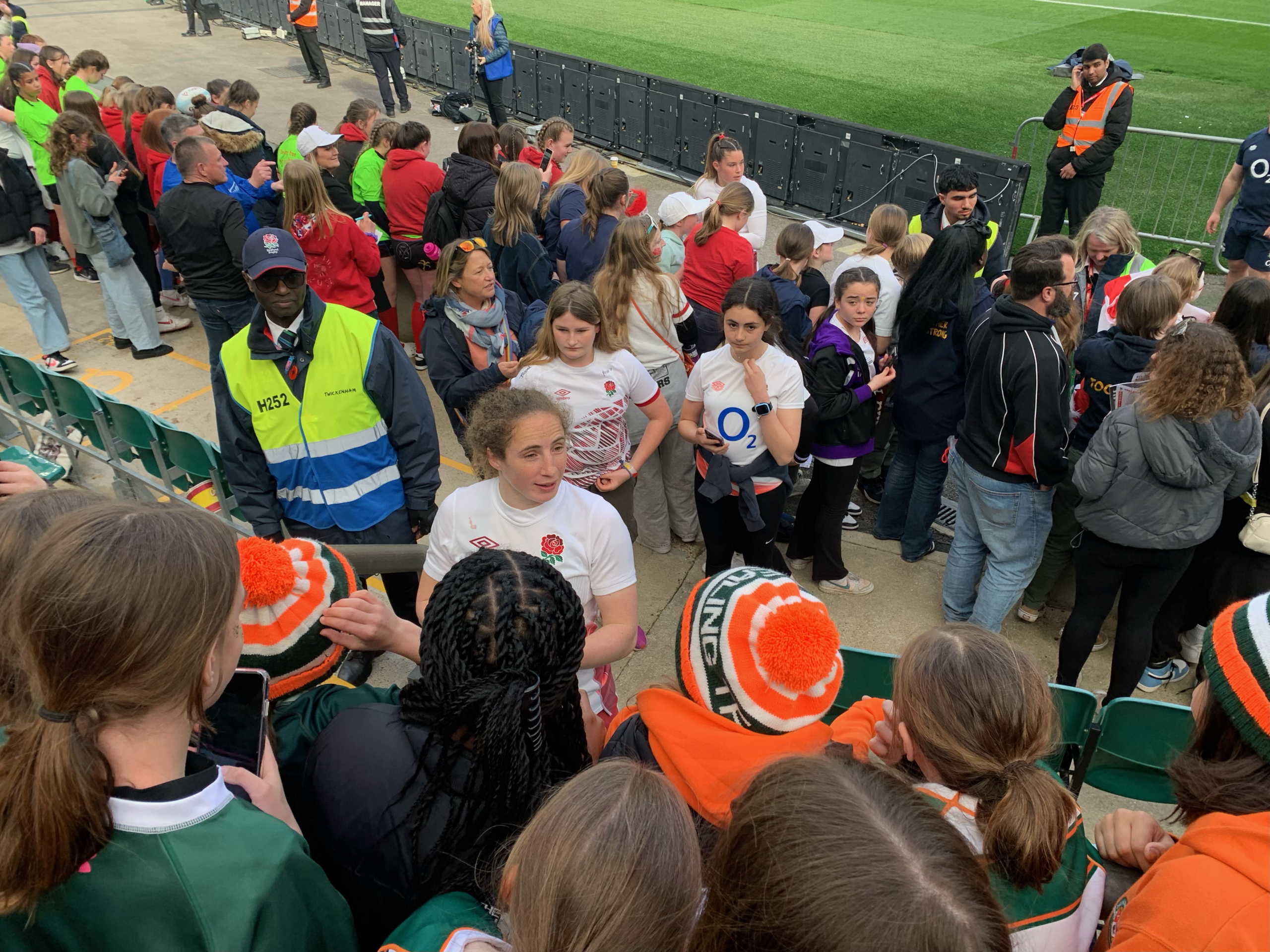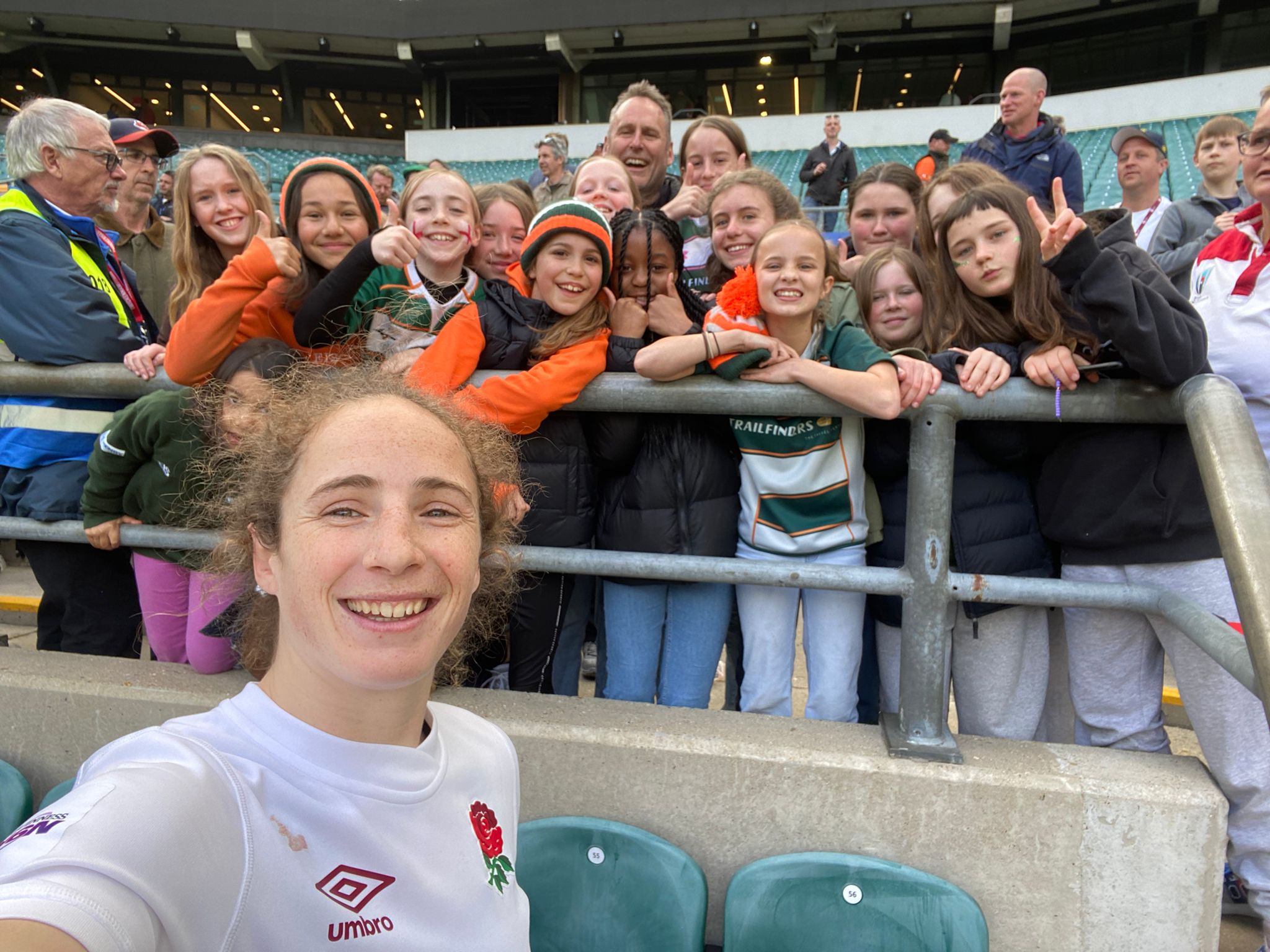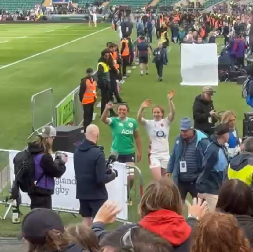 The inspiration for the young Ealing Girls Youth players watching didn’t finish at the 80 minute mark either – as they all stayed on to soak up the post-match Twickenham atmosphere. Much to the girls squeals of excitement they were joined near the corner flag by both Abby and Shannon who came over together to thank, chat with and take pics with their younger Ealing club mates. In chatting with Abby Dow one of the Ealing Girls Youth players, Isabella Macaulay-Coutts, proudly recalls (and tells anyone else that will listen) how she too has scored a try at Twickenham – when she played on the hallowed turf in a Minis Festival for Ealing Under 9s!