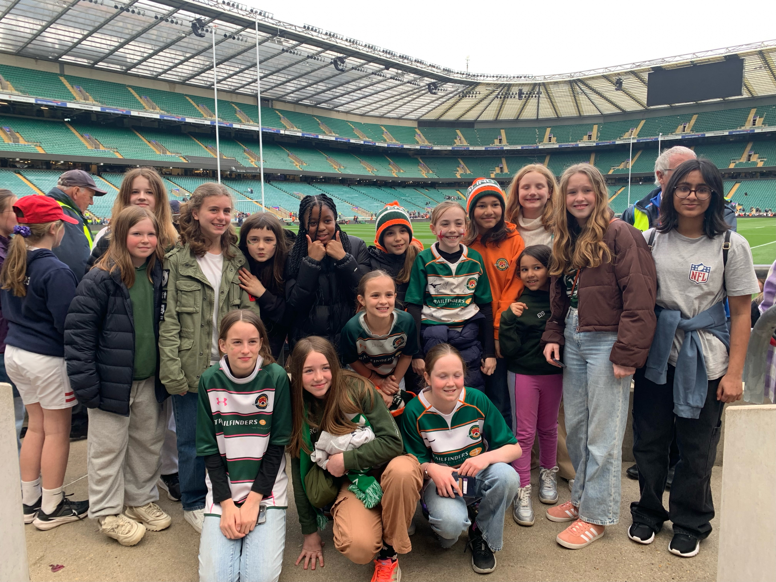 On Saturday 21st April a group of almost 50 players and their parents from the growing Ealing Trailfinders Girls Youth section had their first social rugby outing together. For most of the girls (and some parents) it was their first ever visit to Twickenham Stadium (along with 48,000 others). After a meet up at the Cabbage Patch and some interesting fancy dress entertainment beforehand the group then trudged south west a tad to watch the mighty Red Roses take on Ireland in the Women’s 6 Nations – and what a treat the Ealing Girls were in for both on and off the pitch!
